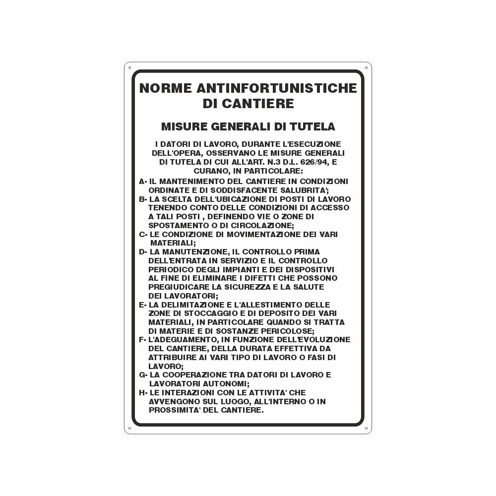 Cartello in alluminio preverniciato bianco spessore 0,5 mm, stampa serigrafica pittogrammi e scritta è obbligatorio usare i mezzi di protezione personale in dotazione a ciascuno. 4 simboli: obbligo uso calzature di sicurezza; obbligo uso guanti; obbligo uso elmetto; obbligo uso cintura di sicurezza. Fori e angoli arrotondati, imballo singolo. Formato 500x333 mm. Conforme D.Lgs. 81/08, UNI 7543.
