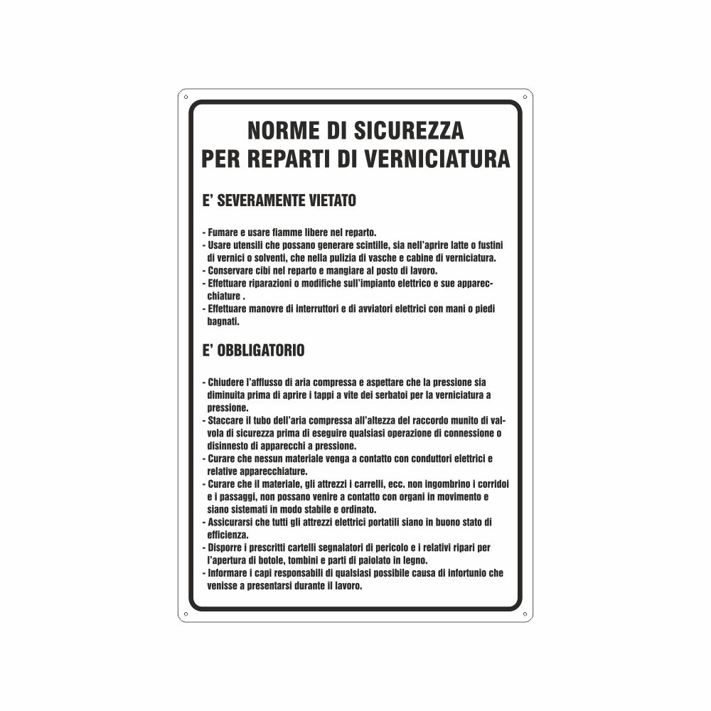 Cartello in alluminio preverniciato giallo spessore 0,5 mm, stampa serigrafica pittogrammi e scritta Vernici, con fori e angoli arrotondati, imballo singolo. Formato 500x333 mm. Conforme D.Lgs. 81-08 e UNI 7543.