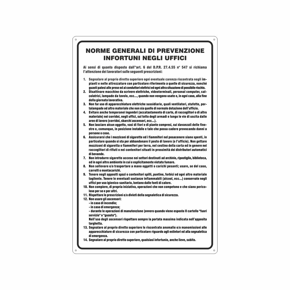 Cartello Vietato fumare con norma e sanzione Cartello in alluminio preverniciato bianco spessore 0,5 mm Pittogramma e scritta Vietato fumare con riportata la norma di riferimento e la sanzione amministrativa Stampa durevole e resistente. Angoli arrotondati Imballo in nylon Disponibile in tre formati: A con dimensione 333x125 mm; G con dimensione 230x310 mm; B con dimensione 333x500 mm Distanza di visibilità: Fomato A 4 metri; Formato G 8 metri; Formato B 12 metri Conforme D.Lgs. 81-08, UNI 7543. Utilizzo: il segnale si applica, come obbligo di legge, in prossimità degli accessi per ricordare il divieto di fumo all'interno degli stabili e locali con riportata la norma di riferimento e la relativa sanzione. Metodo di adesione consigliato: collante siliconico su muro o su superficie liscia e piana