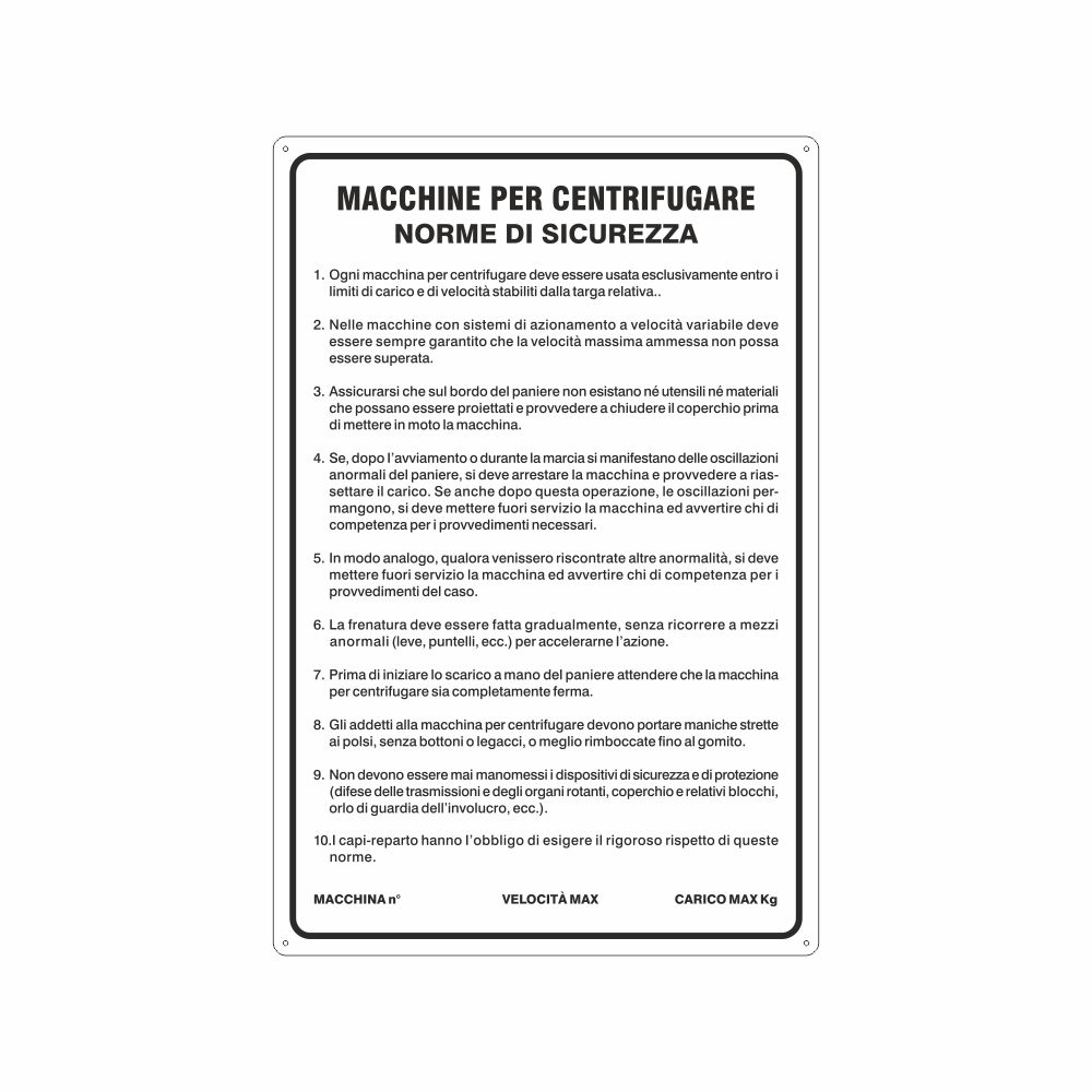 Formati A, B - Cartello in alluminio preverniciato bianco spessore 0,5 mm, stampa serigrafica pittogramma e scritta Assicurarsi che protezioni e sicurezze siano efficienti, con fori e angoli arrotondati, imballo singolo. Conforme D.Lgs. 81/08, UNI 7543. Le misure delle varianti sono espresse in mm.
