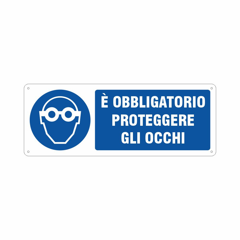 Cartello in alluminio preverniciato bianco spessore 0,5 mm, stampa serigrafica pittogramma e scritta in questa zona è obbligatorio proteggere gli occhi, con fori e angoli arrotondati, imballo singolo. Formato 333x125 mm. Conforme D.Lgs. 81/08, UNI 7543.