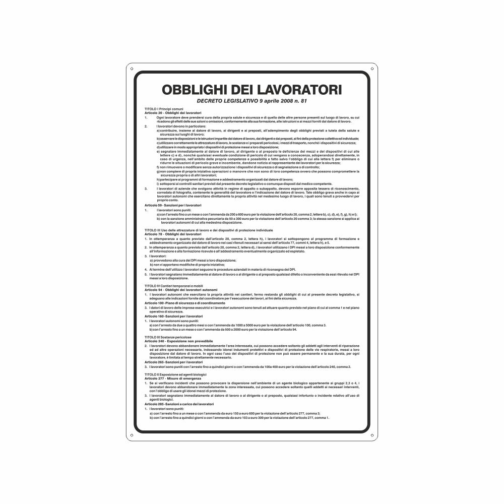 Cartello in alluminio preverniciato bianco spessore 0,5 mm, stampa serigrafica Norme generali prevenzione infortuni, con fori e angoli arrotondati, imballo singolo. Formato 333x500 mm. Conforme D.Lgs. 81-08 e UNI 7543.