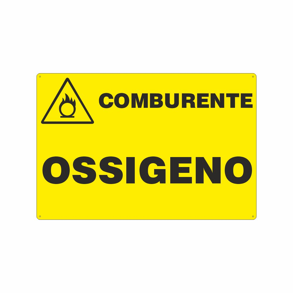 Cartello in alluminio preverniciato giallo spessore 0,5 mm, stampa serigrafica pittogramma e scritta Attenzione sostanze comburenti, con fori e angoli arrotondati, imballo singolo. Conforme D.Lgs. 81-08 e UNI 7543.