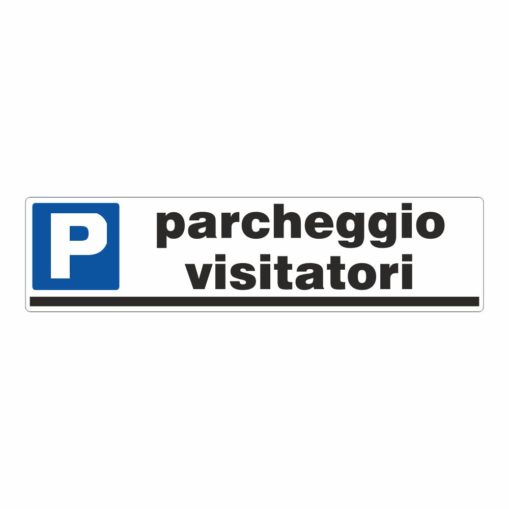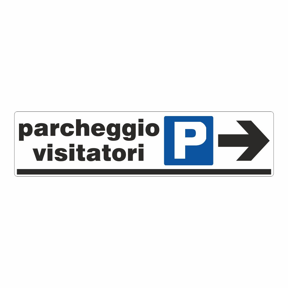 Cartello in alluminio preverniciato bianco spessore 0,5 mm, decorazione in pvc pittogramma e scritta Parcheggio con freccia direzionale. Formato 1000x250 mm. Conforme D.Lgs. 81-08 e UNI 7543.
