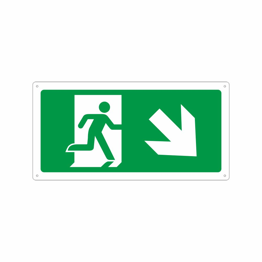 Cartello in alluminio preverniciato bianco, spessore 0,5 mm, stampa digitale con laminazione, percorso di emergenza in basso a destra.