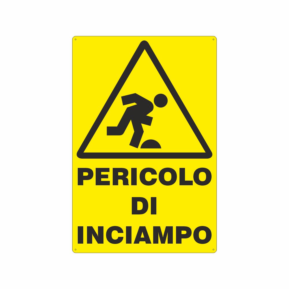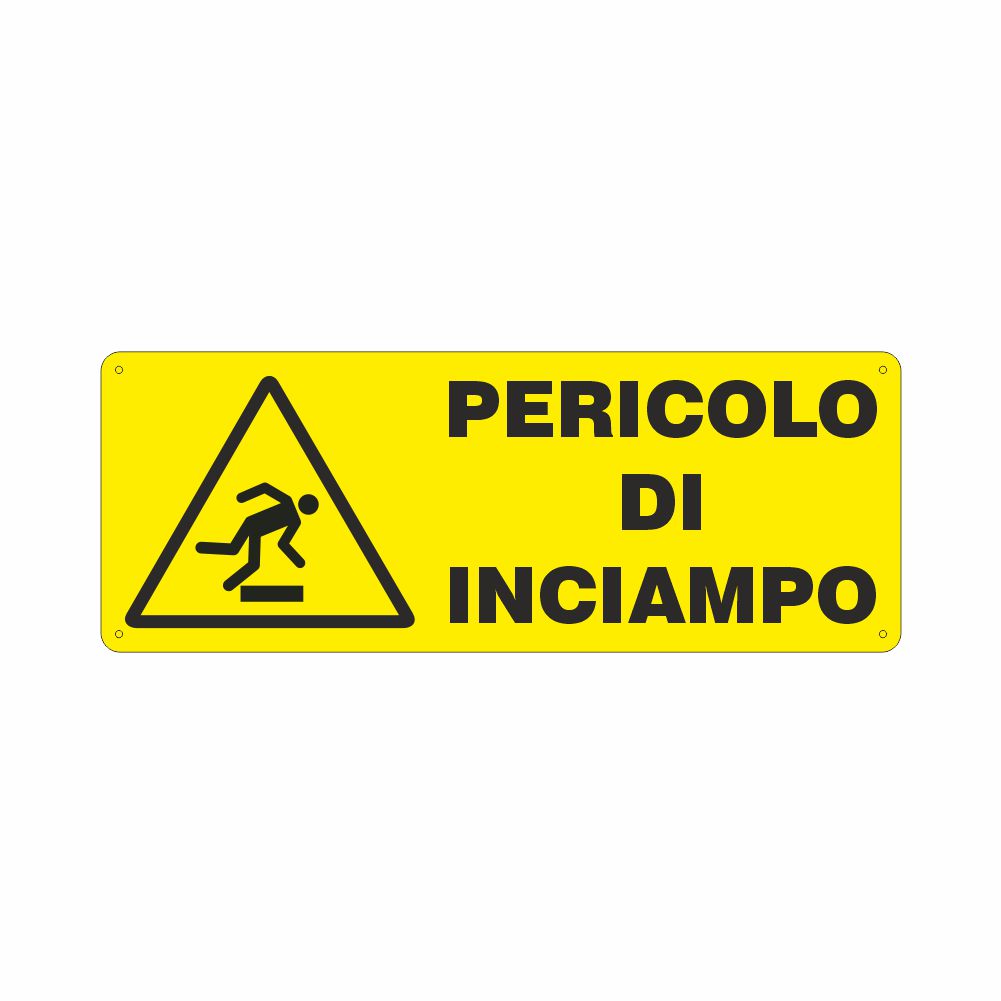 Cartello in alluminio preverniciato giallo spessore 0,5 mm, stampa serigrafica con pittogramma W007 pericolo di inciampo, con fori e angoli arrotondati, imballo singolo. Formato 145x125 mm. Conforme D.Lgs. 81/08, UNI 7543, UNI EN ISO 7010 .