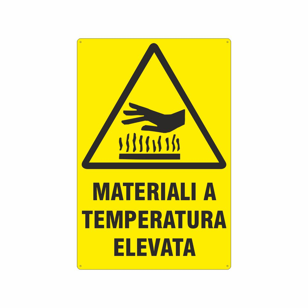 Cartello in alluminio preverniciato giallo spessore 0,5 mm, stampa serigrafica con pittogramma W017 pericolo alta temperatura superficiale, con fori e angoli arrotondati, imballo singolo. Formato 145x125 mm. Conforme D.Lgs. 81/08, UNI 7543, UNI EN ISO 7010 .