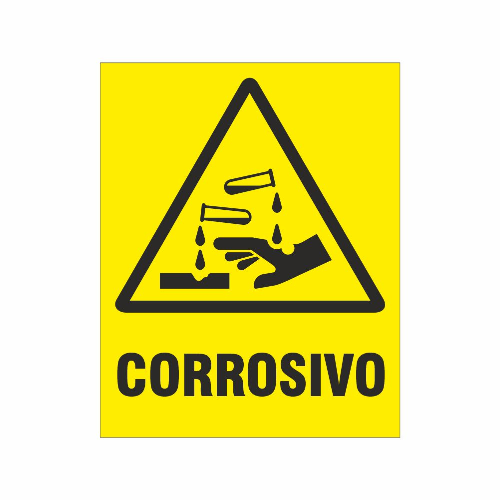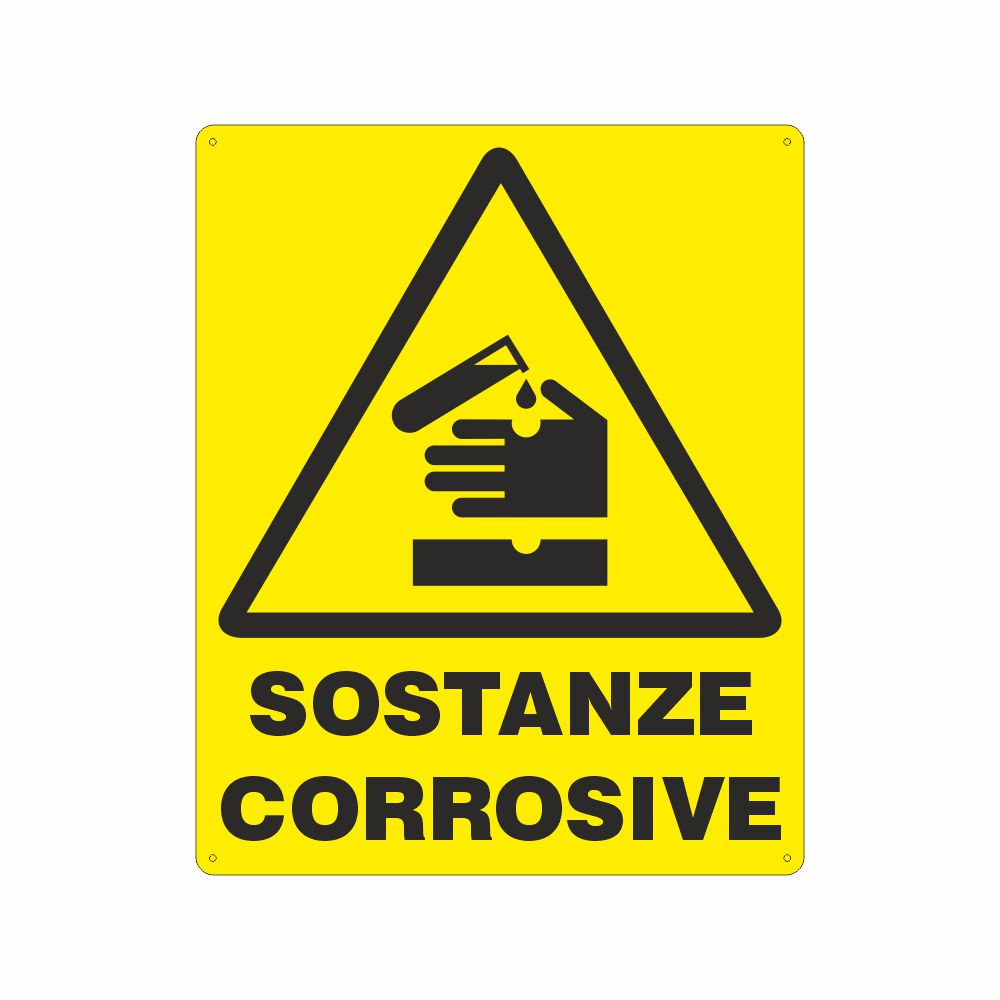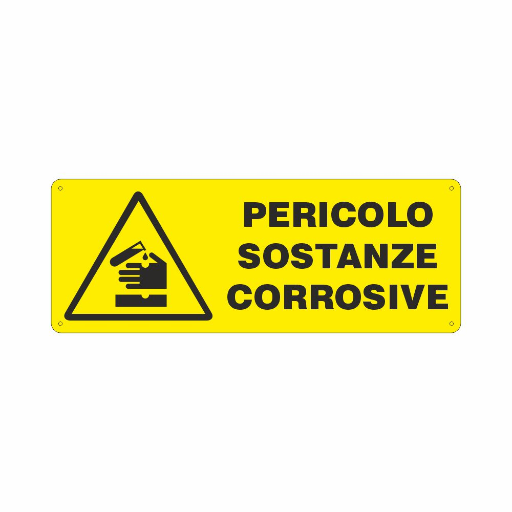 Formato C - Cartello in alluminio preverniciato giallo spessore 0,5 mm, stampa serigrafica pittogramma e scritta Sostanze corrosive, senza fori con angoli al vivo, imballo singolo.