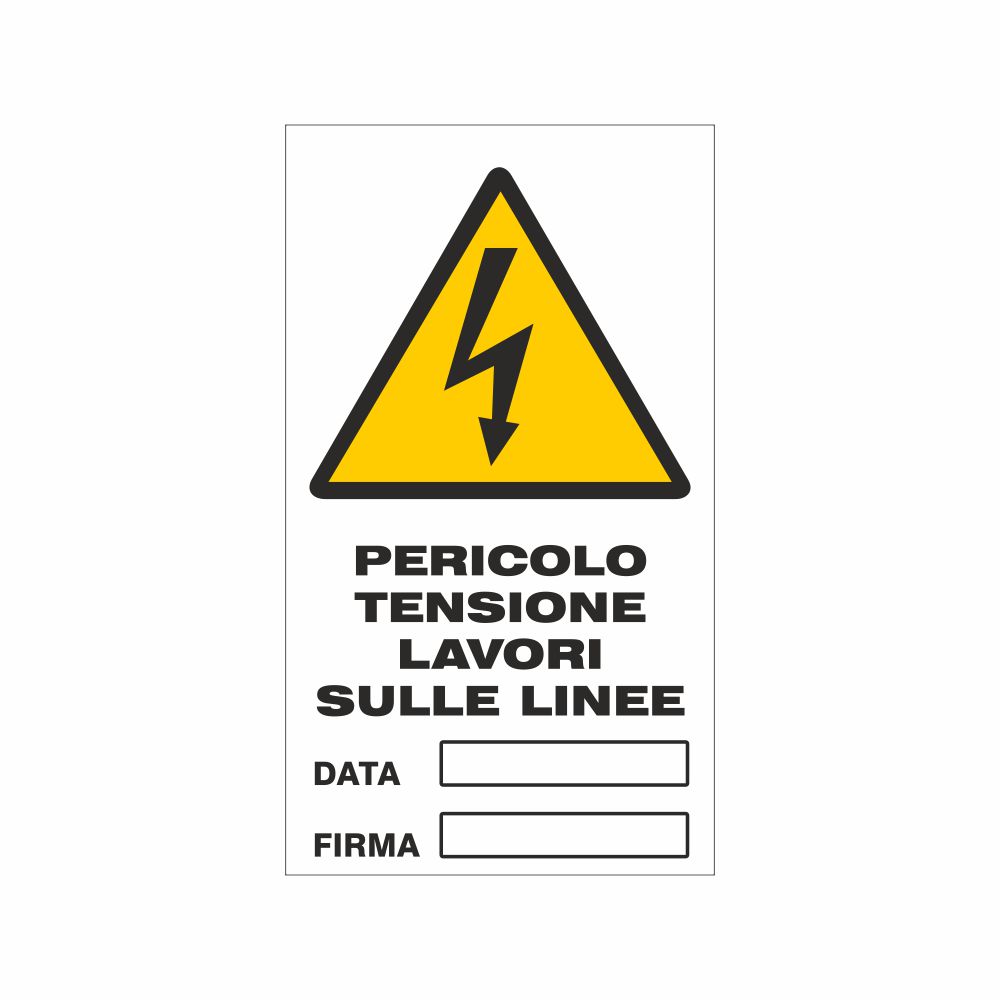 Cartello in alluminio preverniciato bianco spessore 0,5 mm per segnalazione fermo per manutenzione - Pericolo tensione lavori sulle linee con spazio per Data e Firma. Fori sul lato superiore. Formato 75x115 mm.
