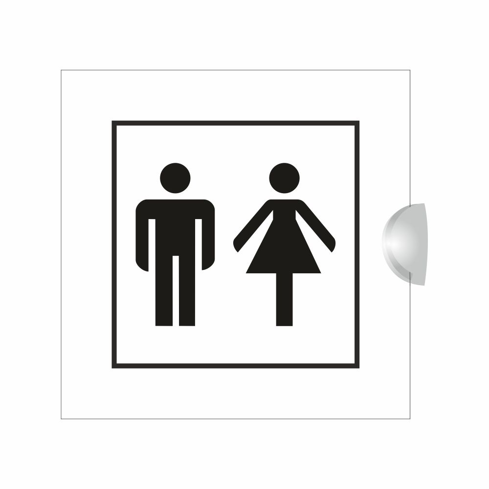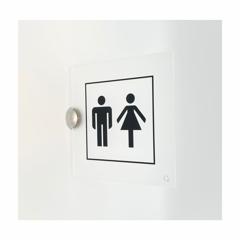 Cartello serie Avantgarde bifacciale, in plexiglass trasparente o satinato, spessore 3 mm, con pittogramma Toilette uomo donna.