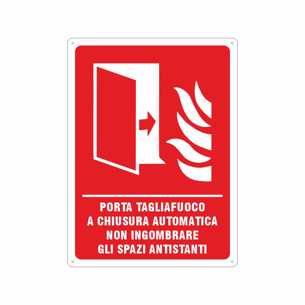 Cartello in adesivo o in alluminio preverniciato bianco spessore 0,5 mm, stampa serigrafica pittogramma e scritta Porta tagliafuoco a chiusura automatica conforme UNI EN ISO 7010. Indicato dal Codice Prevenzione Incendi (aggiornamento 2021) per segnalare le porte tagliafuoco - Paragrafo S.3.5.7 - tabella S.3-4. Conforme D.Lgs. 81-08, UNI 7543, UNI EN ISO 7010.