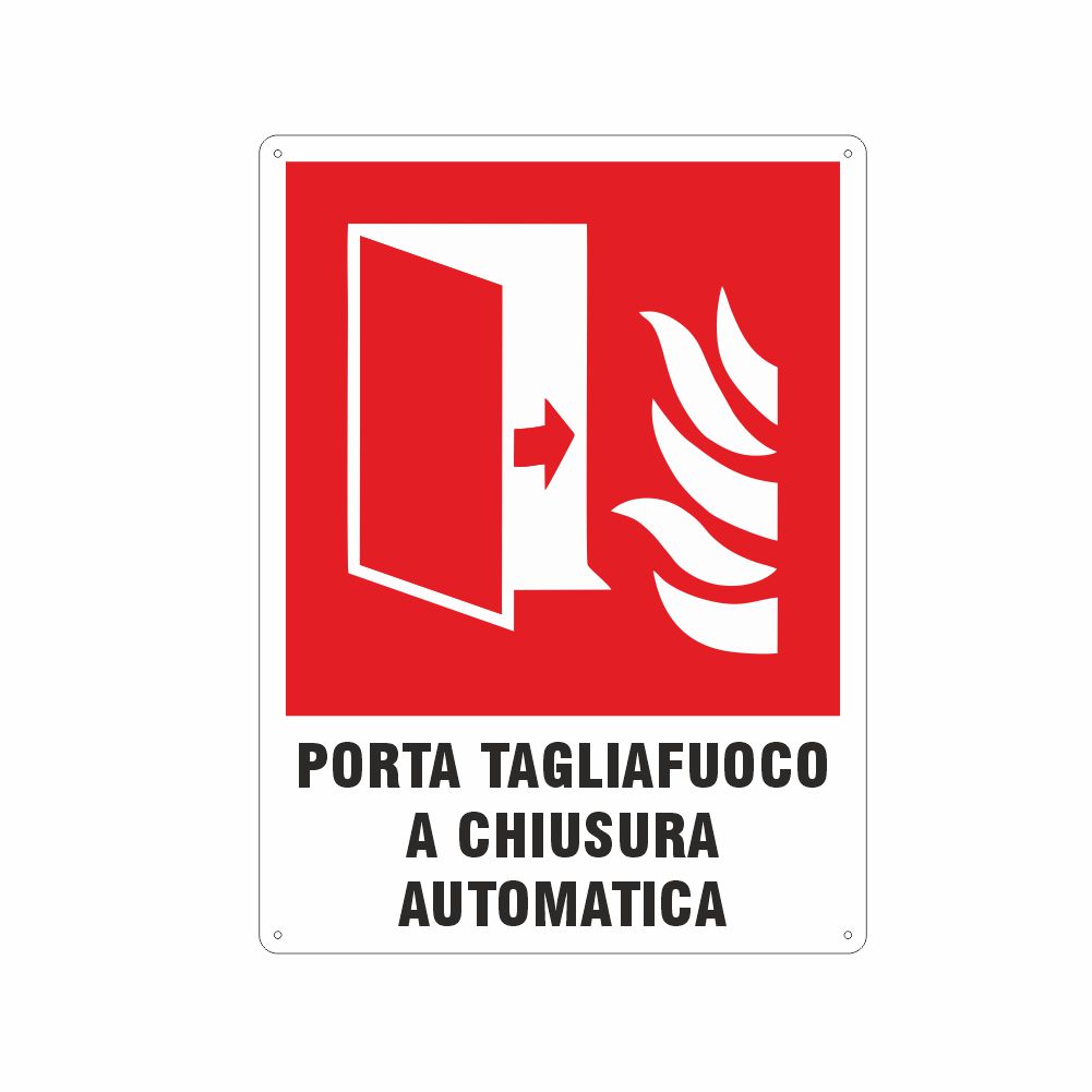 Cartello in adesivo o in alluminio preverniciato bianco spessore 0,5 mm, stampa serigrafica pittogramma e scritta Porta tagliafuoco a chiusura automatica conforme UNI EN ISO 7010.