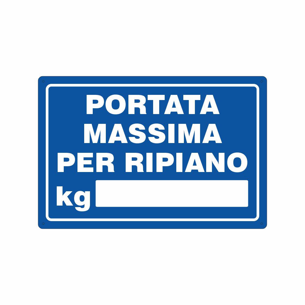 Cartello in alluminio preverniciato blu spessore 0,5 mm, stampa serigrafica scritta Portata massima per ripiano con spazio per indicare la portata. Formato 333x125 mm. Conforme D.Lgs. 81-08, UNI 7543.