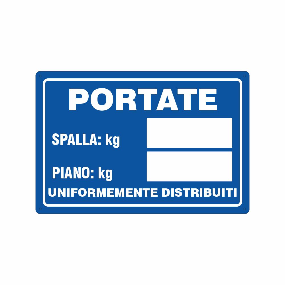 Cartello in alluminio preverniciato blu spessore 0,5 mm, stampa serigrafica scritta Portata Massima con spazio per l'indicazione della portata. Conforme D.Lgs. 81-08, UNI 7543.