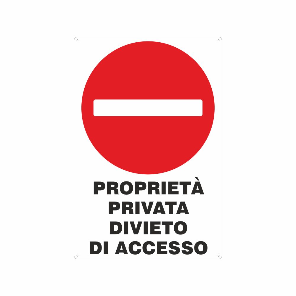 Cartello in alluminio preverniciato bianco spessore 0,5 mm, stampa serigrafica pittogramma e scritta Proprietà privata Divieto di accesso. Formato 300x200 mm. Conforme D.Lgs. 81-08, UNI 7543.