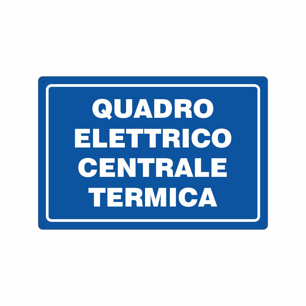 Cartello in alluminio preverniciato blu spessore 0,5 mm, stampa serigrafica scritta interruttore elettrico centrale termica. Formato 200x150 mm. Conforme D.Lgs. 81-08, UNI 7543.
