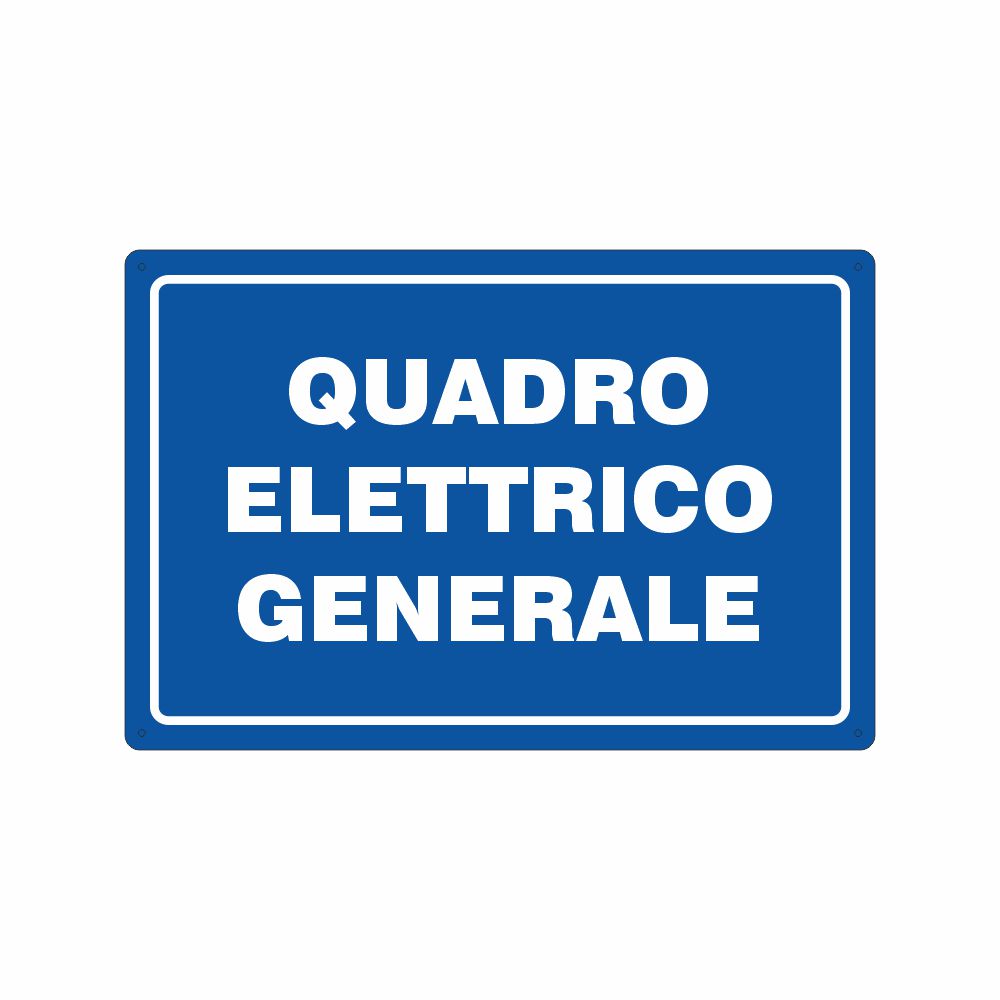 Cartello in alluminio preverniciato blu spessore 0,5 mm, stampa serigrafica scritta interruttore elettrico generale. Conforme D.Lgs. 81-08, UNI 7543.