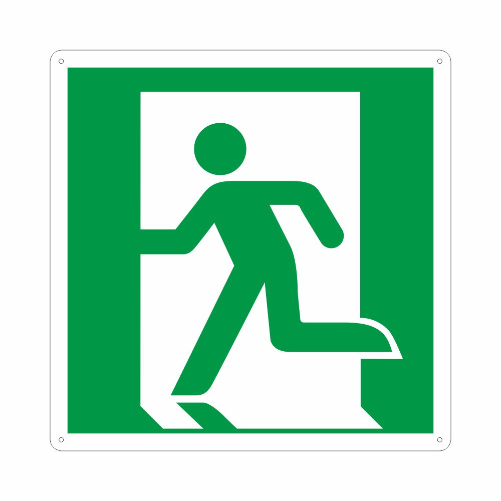 Cartello in alluminio preverniciato bianco (formato F) o verde (formato B), spessore 0,5 mm, stampa serigrafica pittogramma percorso di esodo a sinistra conforme UNI EN ISO 7010.