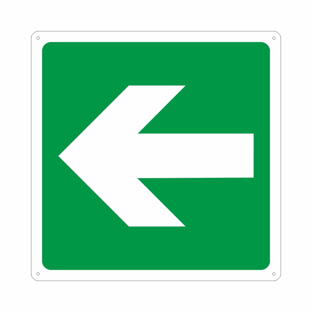 Sistema composto da due cartelli in alluminio preverniciato bianco (formato F) o verde (formato B), spessore 0,5 mm, stampa pittogramma E001 percorso di esodo a sinistra e pittogramma E005 freccia direzionale, conformi UNI EN ISO 7010. Variante F Formato cartello singolo 230x230 mm, dimensione totale del sistema 460x230 mm. Distanza di visibilità del segnale composito 7,80 metri. Variante B Formato cartello singolo 333x333 mm, dimensione totale del sistema 666x333 mm Distanza di visibilità del segnale composito 20,90 metri. La freccia è orientabile ad intervalli di 90°. In questo modo, con due soli segnali, potrete avere tre combinazioni possibili di direzione: a sinistra, in avanti e in basso. Il massimo della flessibilità al minor costo! Conforme D.Lgs. 81-08, UNI 7543, UNI EN ISO 7010.