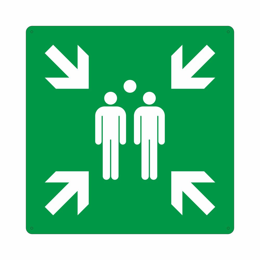 Cartello in alluminio preverniciato bianco (formato F) o verde (formato B), spessore 0,5 mm, stampa serigrafica pittogramma e scritta Punto di ritrovo. Conforme D.Lgs. 81-08, UNI 7543, UNI EN ISO 7010. Le misure delle varianti sono espresse in mm.