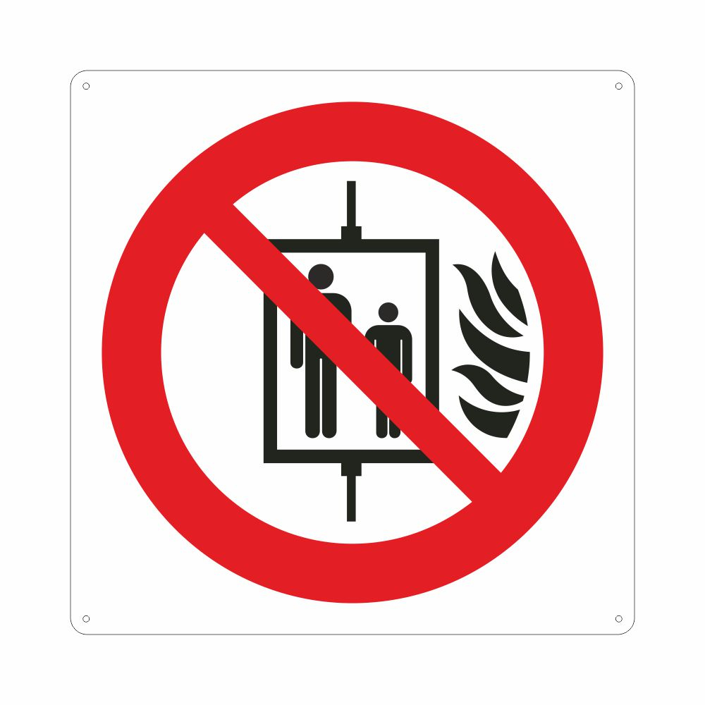 Cartello in alluminio preverniciato rosso spessore 0,5 mm, stampa serigrafica pittogrammi e scritta In caso di incendio non usare l'ascensore. Formato 230x110 mm. Conforme D.Lgs. 81-08, UNI 7543.