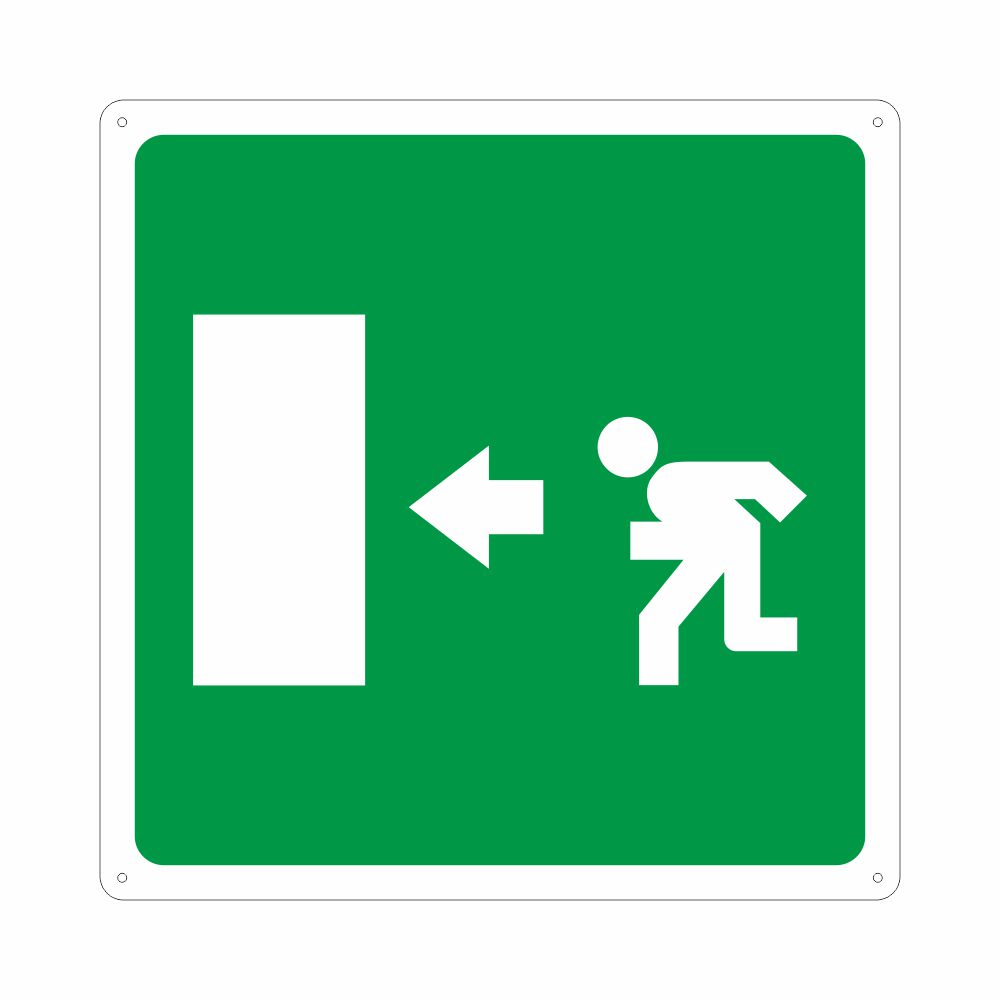 Cartello in alluminio preverniciato bianco (formato F) o verde (formato B), spessore 0,5 mm, stampa serigrafica pittogramma percorso di esodo a sinistra conforme UNI EN ISO 7010. Per una corretta applicazione va associato al cartello S40401 freccia direzionale o S40405 freccia obliqua. Conforme D.Lgs. 81-08, UNI 7543, UNI EN ISO 7010. Le misure delle varianti sono espresse in mm.