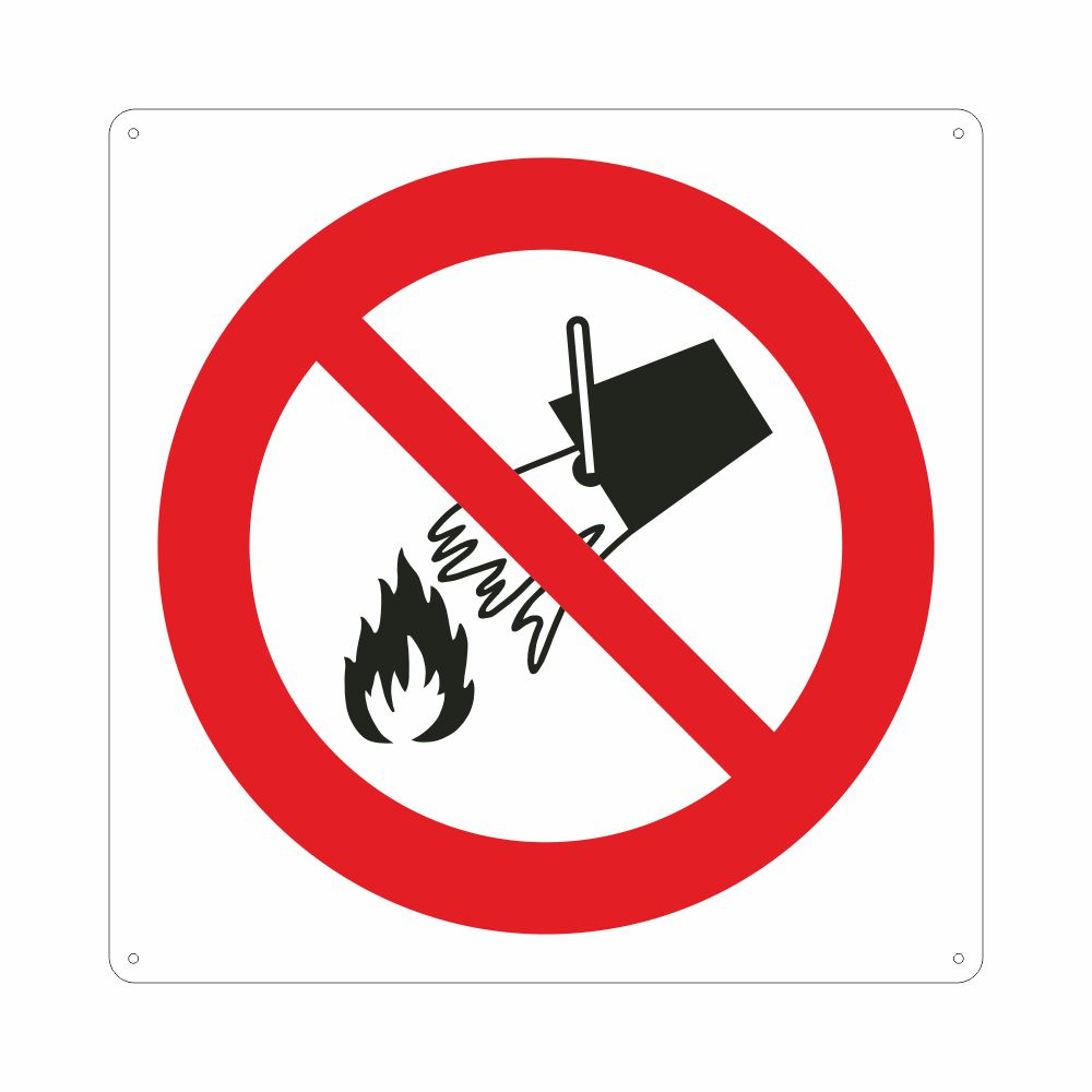 Cartello in alluminio preverniciato bianco spessore 0,5 mm formato 270x270 mm, stampa serigrafica pittogramma Vietato usare acqua per spegnere incendi, con fori e angoli arrotondati, imballo singolo. Conforme D.Lgs. 81-08, UNI 7543.