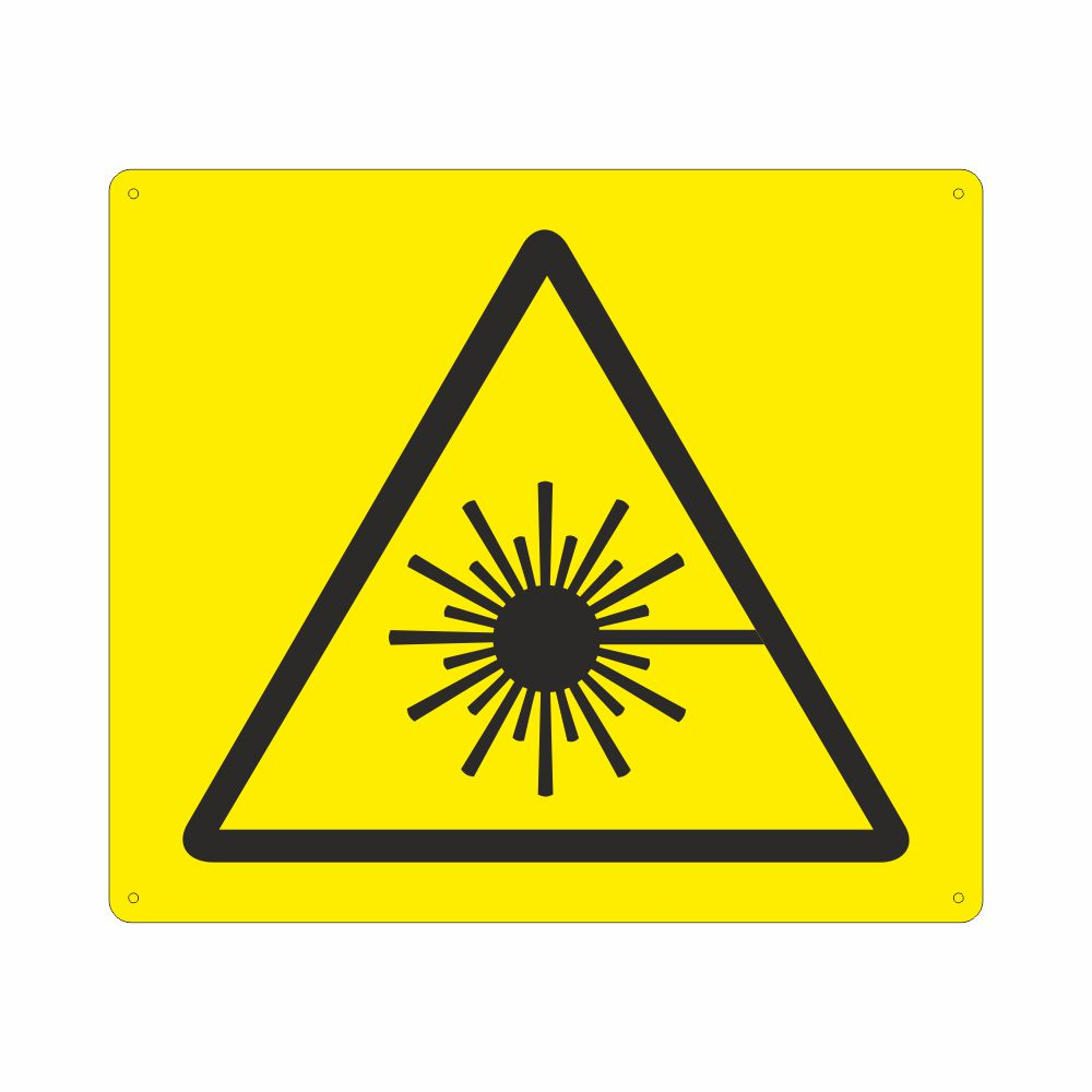 Cartello in alluminio preverniciato giallo spessore 0,5 mm, stampa serigrafica con pittogramma pericolo radiazioni ultraviolette da saldatura, con fori e angoli arrotondati, imballo singolo. Formato 145x125 mm. Conforme UNI 7543 .