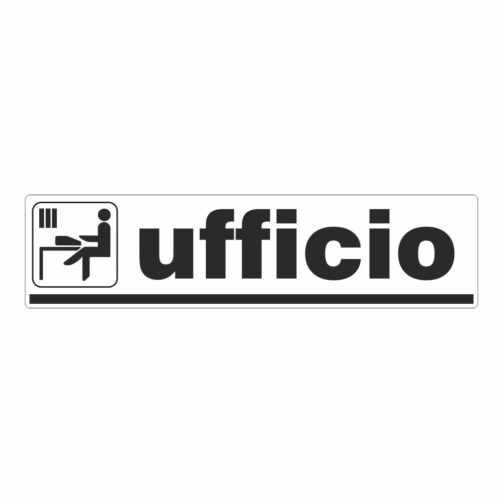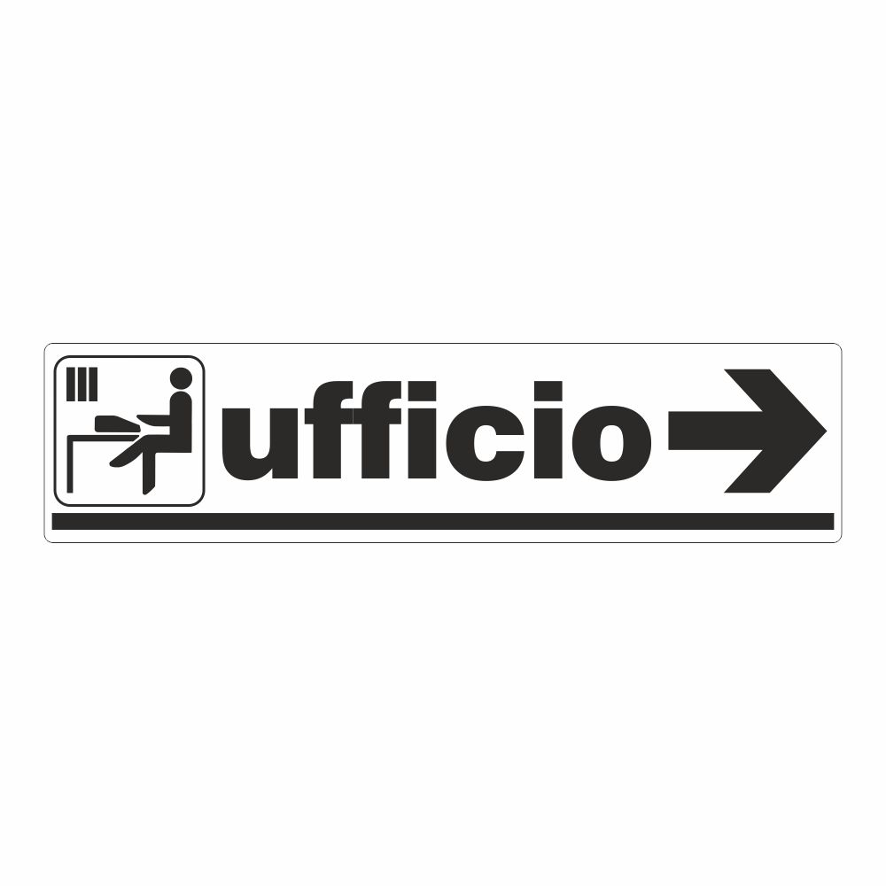 Cartello in alluminio preverniciato bianco spessore 0,5 mm, decorazione in pvc pittogramma e scritta uscita Uffici freccia direzionale. Formato 1000x250 mm. Conforme D.Lgs. 81-08 e UNI 7543.