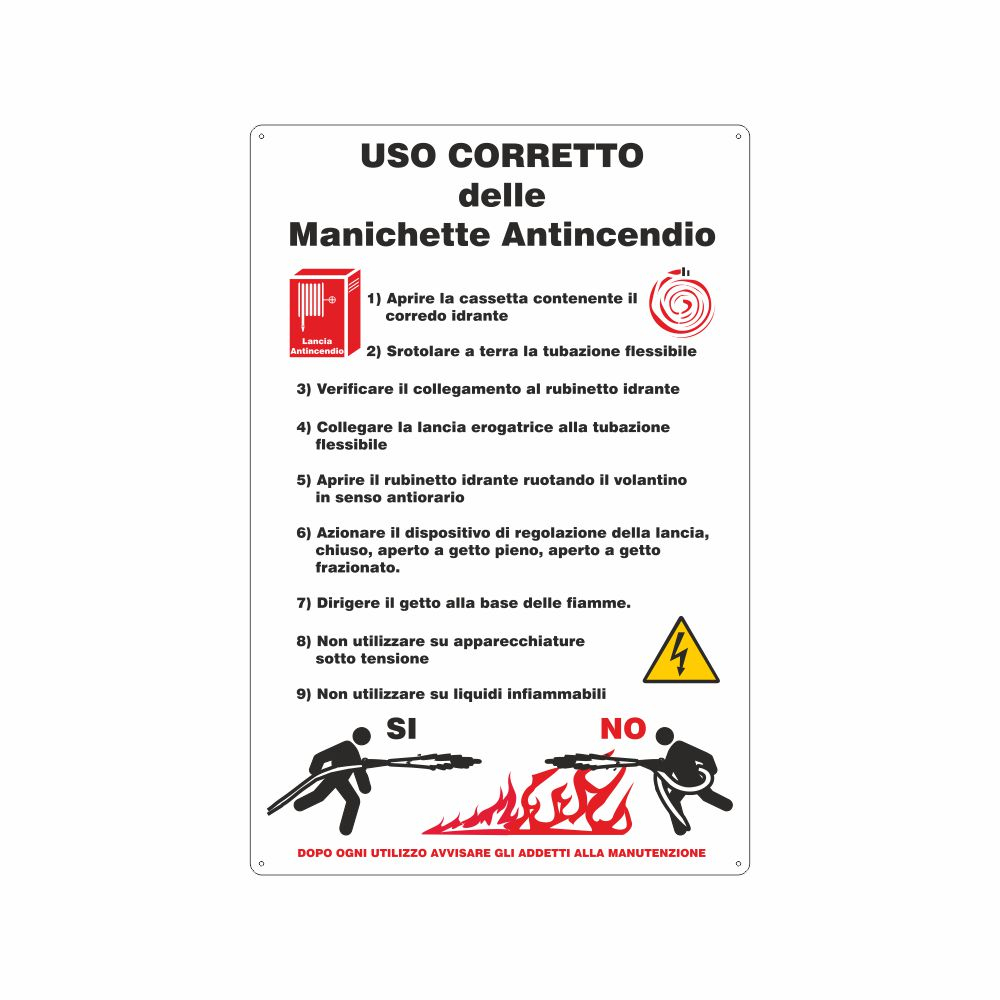 Utilizzo: il cartello è informativo e riporta le istruzioni per il corretto utilizzo delle tubazioni flessibili antincendio, anche dette manichette antincendio. Va applicato in prossimità delle cassette idrante, dei rubinetti idrante, dei corredi idrante.