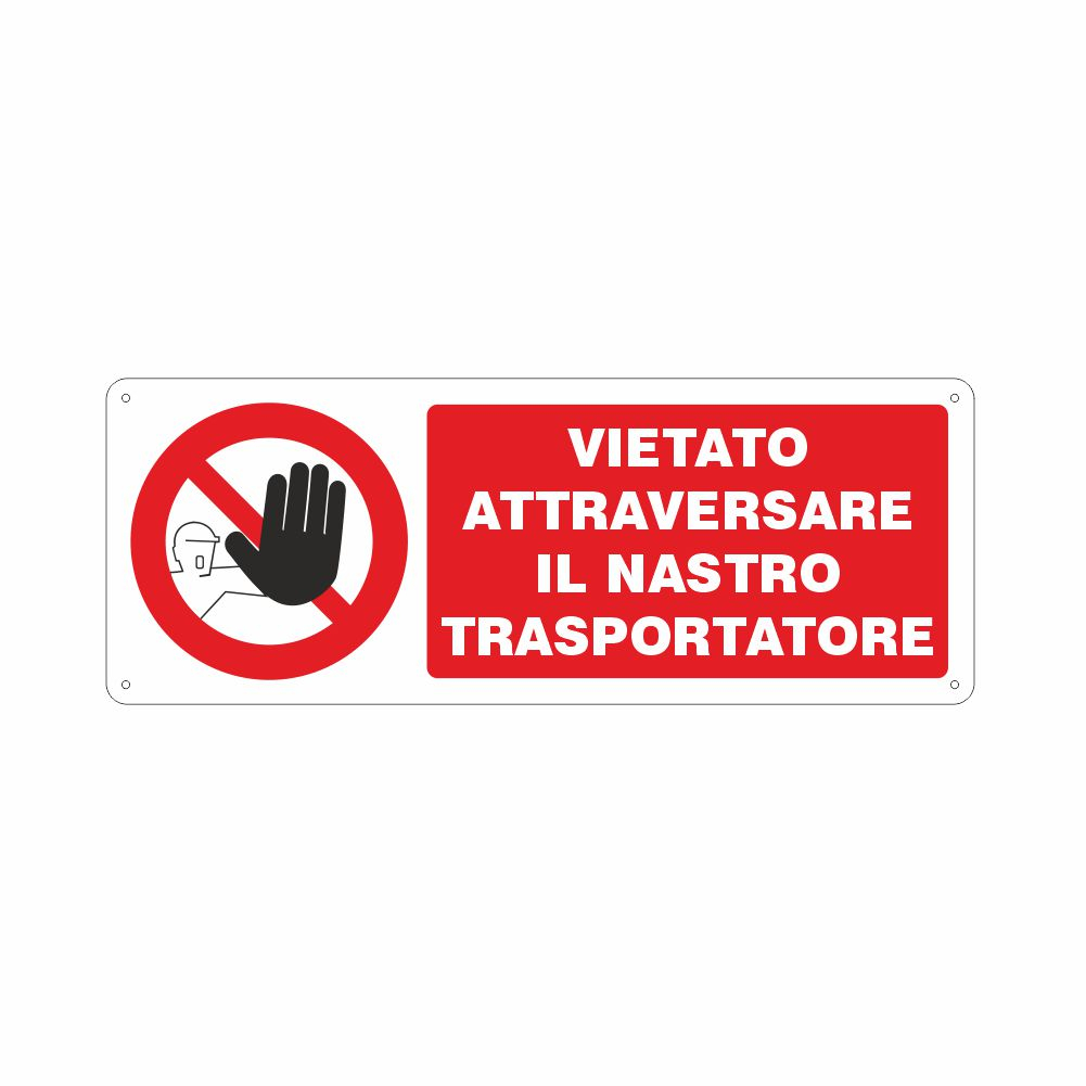 Cartello in alluminio preverniciato giallo spessore 0,5 mm, stampa serigrafica pittogramma e scritta Attenzione al nastro trasportatore in movimento, con fori e angoli arrotondati, imballo singolo. Formato 333x125 mm. Conforme D.Lgs. 81-08 e UNI 7543.
