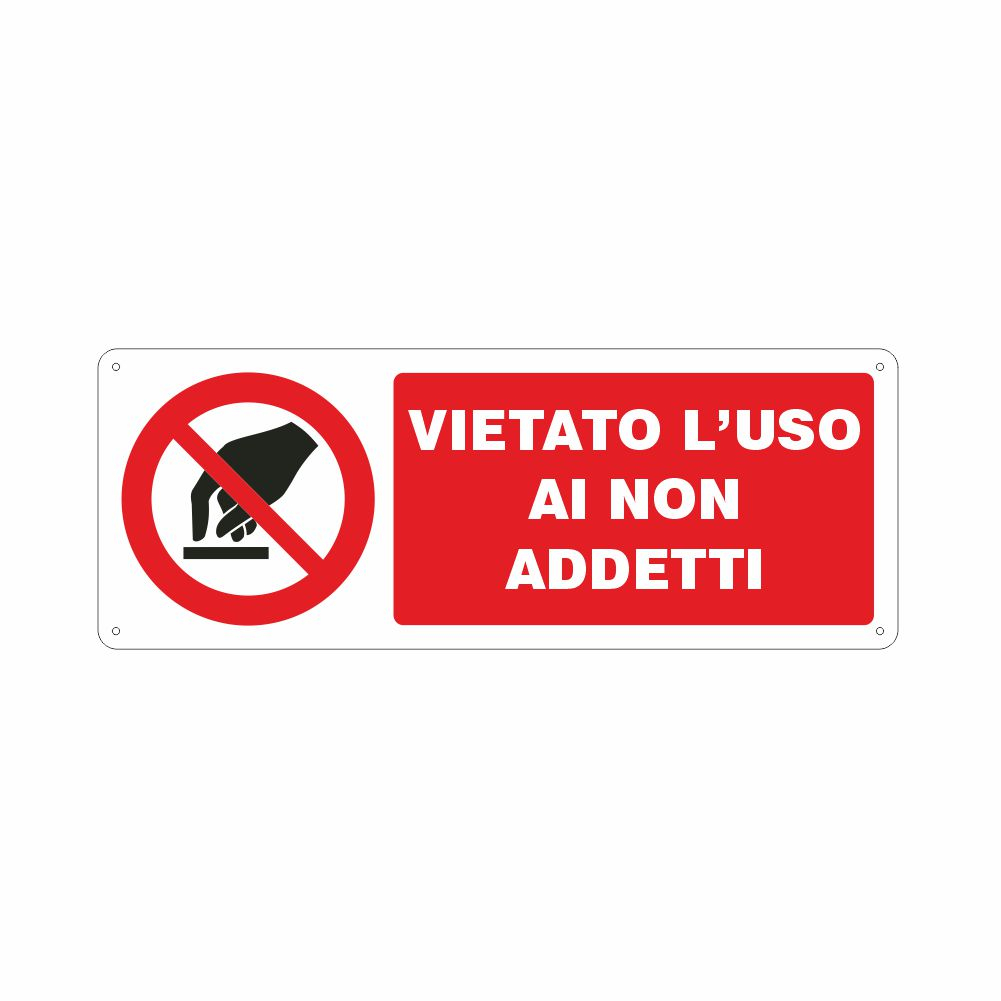 Formato B - Cartello in alluminio preverniciato bianco spessore 0,5 mm, stampa serigrafica pittogramma e scritta Vietato l'uso ai non addetti, con fori e angoli arrotondati, imballo singolo.