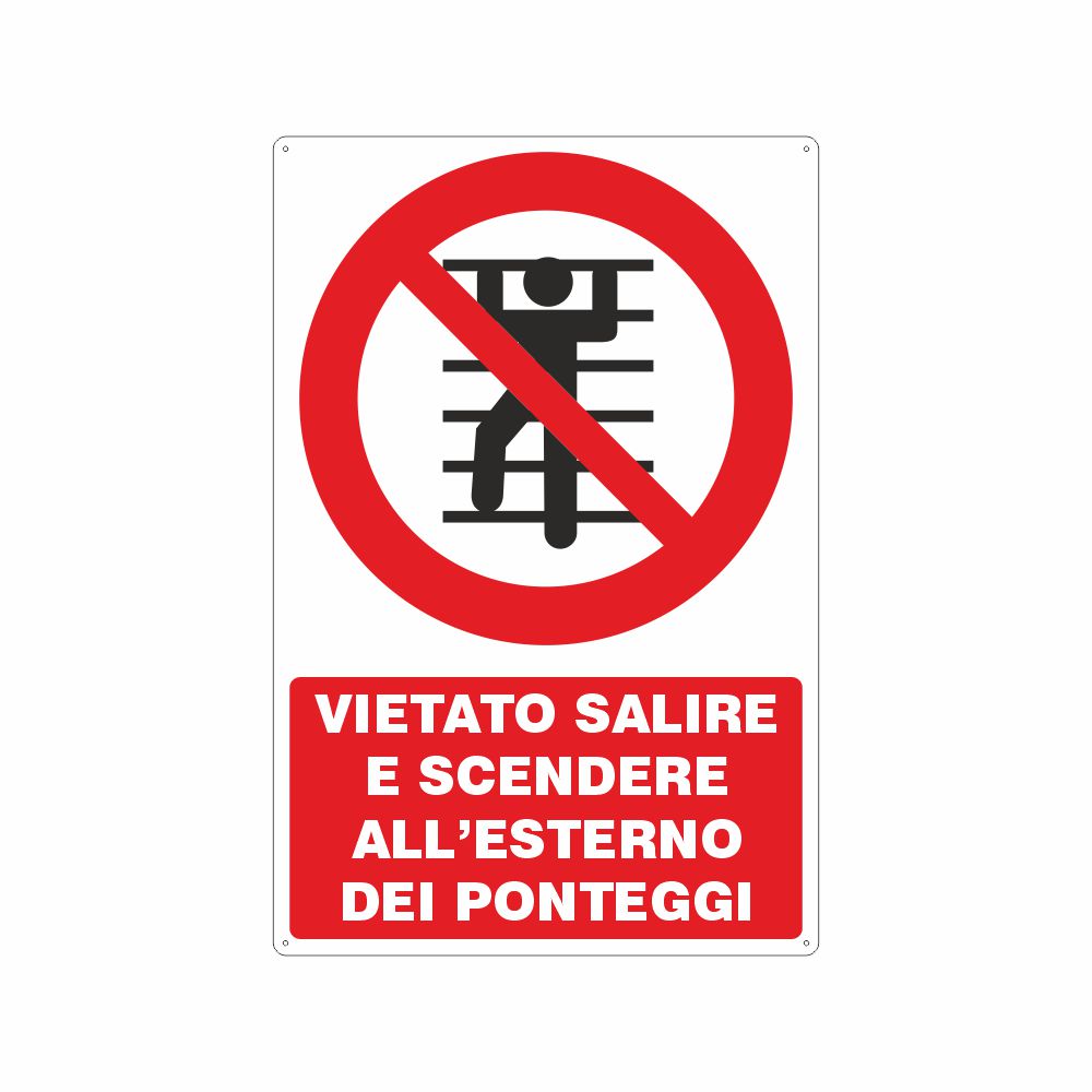 Cartello in alluminio preverniciato bianco spessore 0,5 mm, stampa serigrafica pittogramma e scritta Vietato salire e scendere all'esterno dei ponteggi, con fori e angoli arrotondati, imballo singolo.