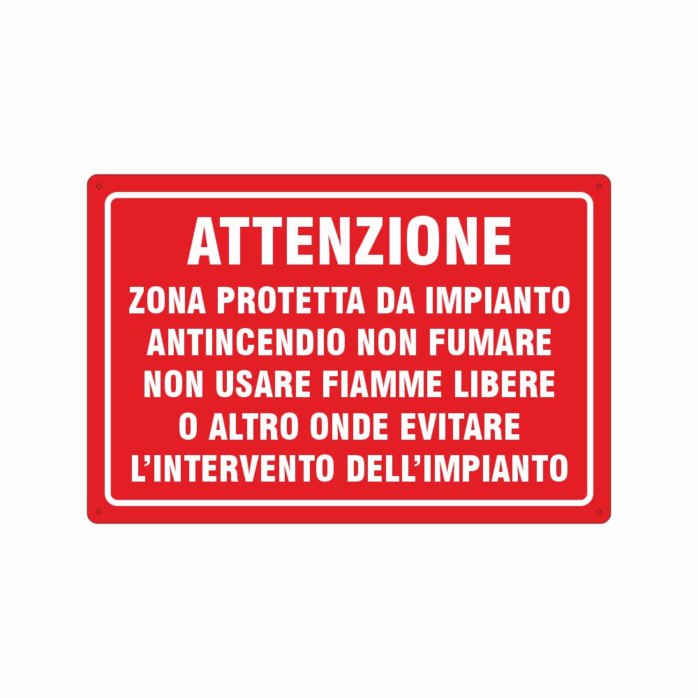 Cartello in alluminio preverniciato rosso spessore 0,5 mm, stampa serigrafica scritta Attenzione - Zona protetta da impianto antincendio - non fumare, non usare fiamme libere o altro onde evitare l'intervento dell'impianto.