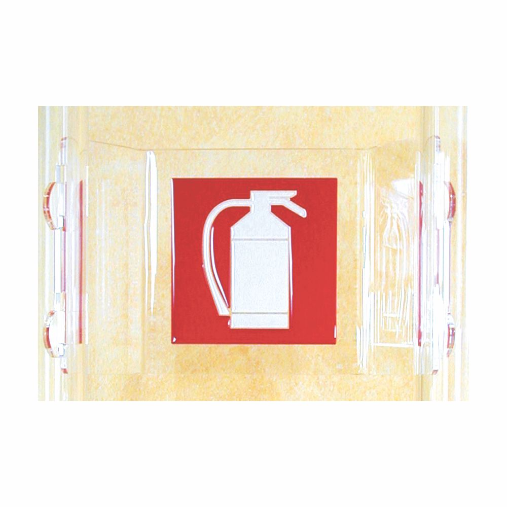 Inserto con decorazione incisa e smaltata con pittogrammi conformi D.Lgs. 81/08 per Piantana porta estintore modello First, in plexiglass trasparente altezza 2 metri. In foto un particolare dell'inserto inciso e smaltato.