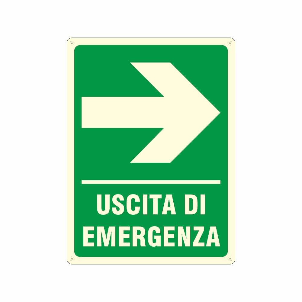 stampa serigrafica pittogramma e scritta uscita di emergenza a destra, da associare ai cartelli con codice S40402 ISO e S40403 ISO per la conformità alla norma UNI EN ISO 7010, con laminazione luminescente oppure Decorazione in pvc con base luminescente certficata DIN 67510 parte 1.