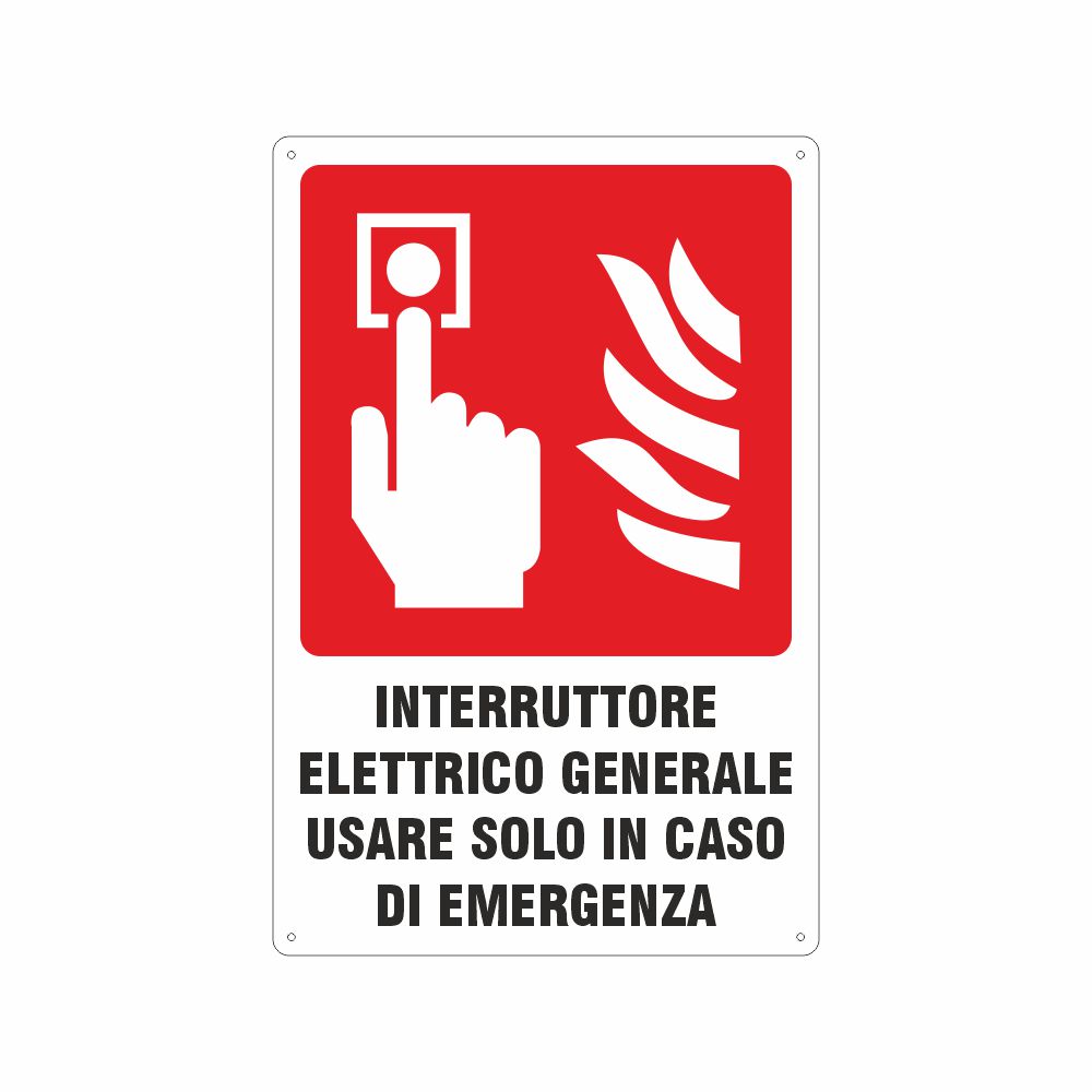 Cartello in alluminio preverniciato rosso spessore 0,5 mm, stampa serigrafica scritta Interruttore elettrico generale - usare in caso d'emergenza. Conforme D.Lgs. 81-08, UNI 7543.