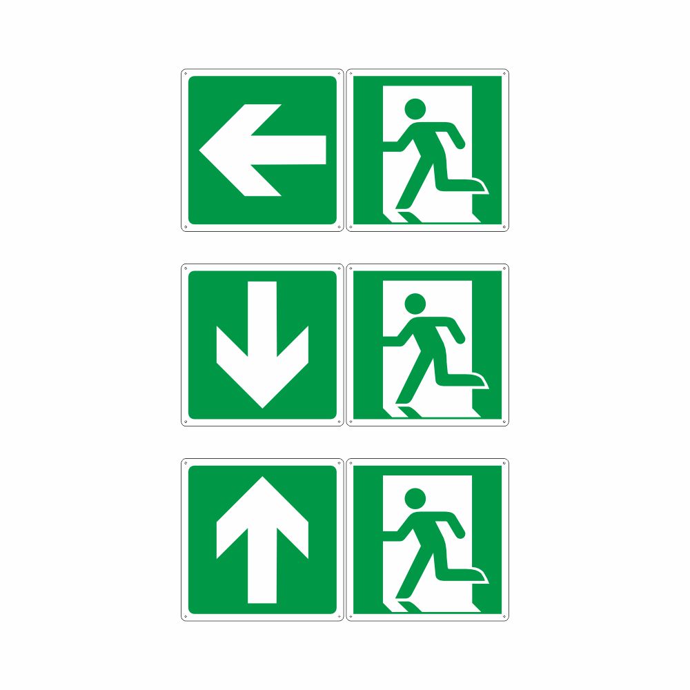Sistema composto da due cartelli in alluminio preverniciato bianco (formato F) o verde (formato B), spessore 0,5 mm, stampa pittogramma E001 percorso di esodo a sinistra e pittogramma E005 freccia direzionale, conformi UNI EN ISO 7010.