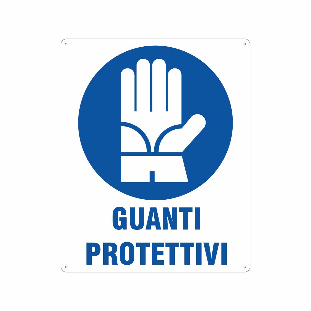 Cartello in alluminio preverniciato bianco 125x125 mm, spessore 0,5 mm, stampa serigrafica pittogramma obbligo uso guanti, con fori e angoli arrotondati. Conforme D.Lgs. 81-08 e UNI 7543.