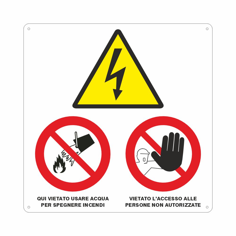 Cartello in alluminio preverniciato bianco spessore 0,5 mm, stampa UV, per cabina elettrica con simboli: pericolo corrente elettrica, non usare acqua per spegnere incendi e vietato l'accesso alla persone non autorizzate. Fori e angoli arrotondati .