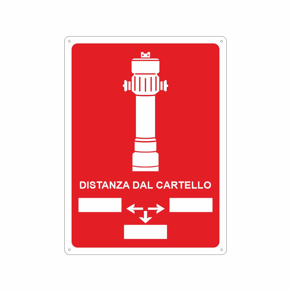 Cartello in alluminio preverniciato bianco, spessore 0,5 mm, stampa serigrafica pittogramma colonna idrante con indicazione sulla distanza dal cartello. Formato 230x310 mm. Conforme D.Lgs. 81-08, UNI 7543.