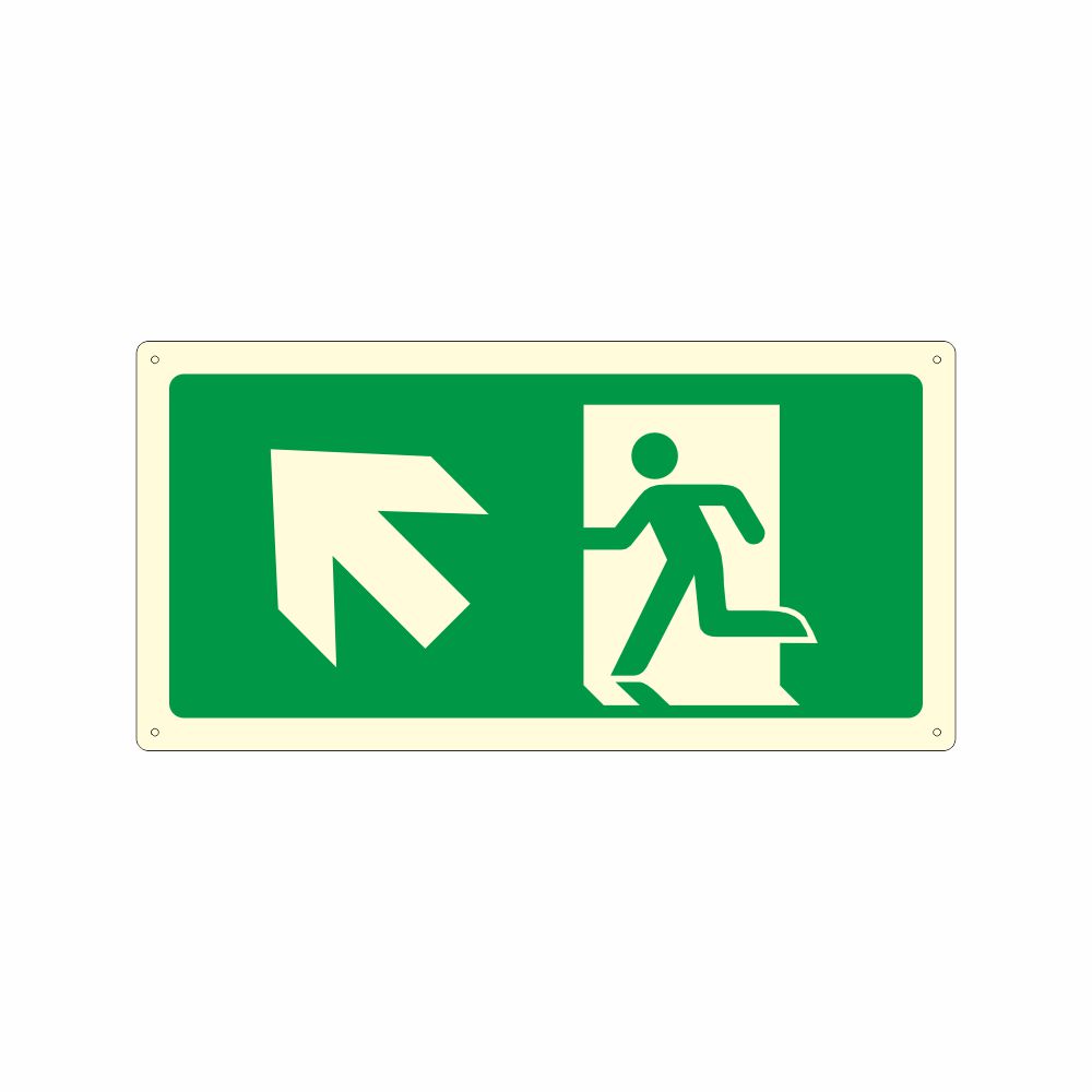 Pittogramma Uscita di emergenza in altp a sinistra conforme UNI EN ISO 7010, con laminazione luminescente oppure Decorazione in pvc con base luminescente certficata DIN 67510 parte 1.