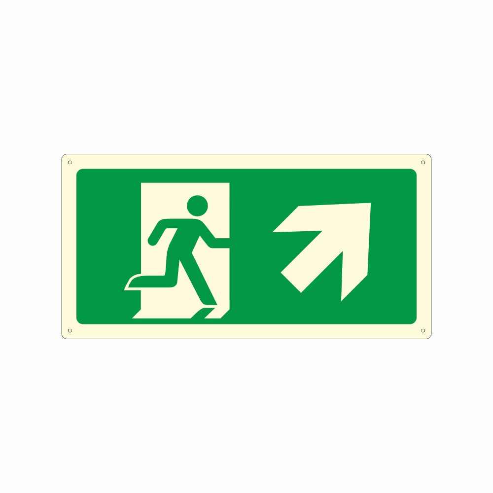 Pittogramma Uscita di emergenza in alto a destra conforme UNI EN ISO 7010, con laminazione luminescente oppure Decorazione in pvc con base luminescente certficata DIN 67510 parte 1.