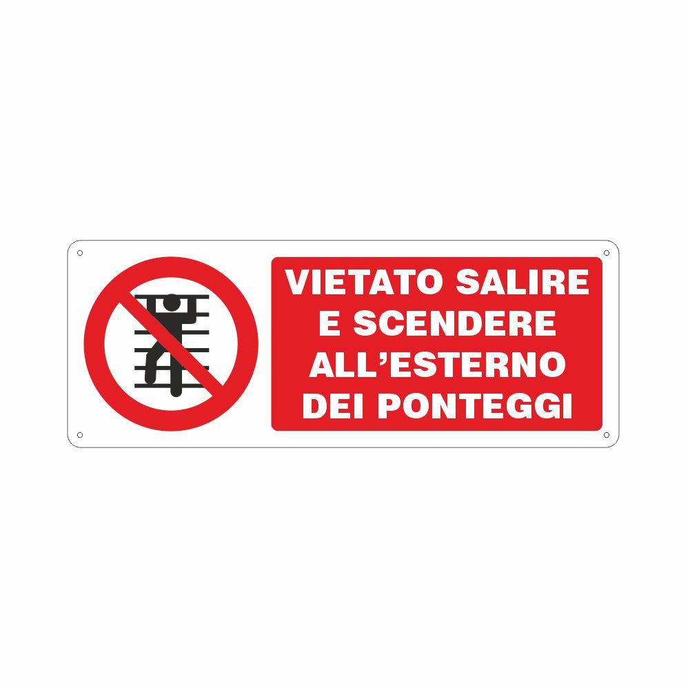 Cartello in alluminio preverniciato bianco spessore 0,5 mm, stampa serigrafica pittogramma e scritta Vietato salire e scendere all'esterno dei ponteggi, con fori e angoli arrotondati, imballo singolo.