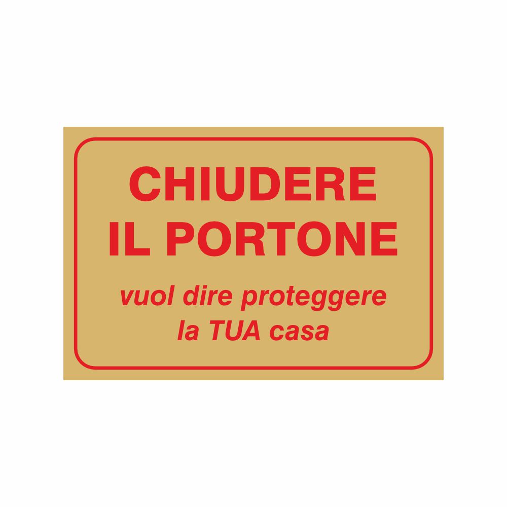 Cartello in alluminio preverniciato bianco spessore 0,5 mm, stampa serigrafica fondo oro scritta rossa Chiudere il Portone vuol dire proteggere la tua casa, angoli al vivo.