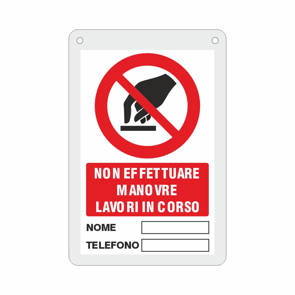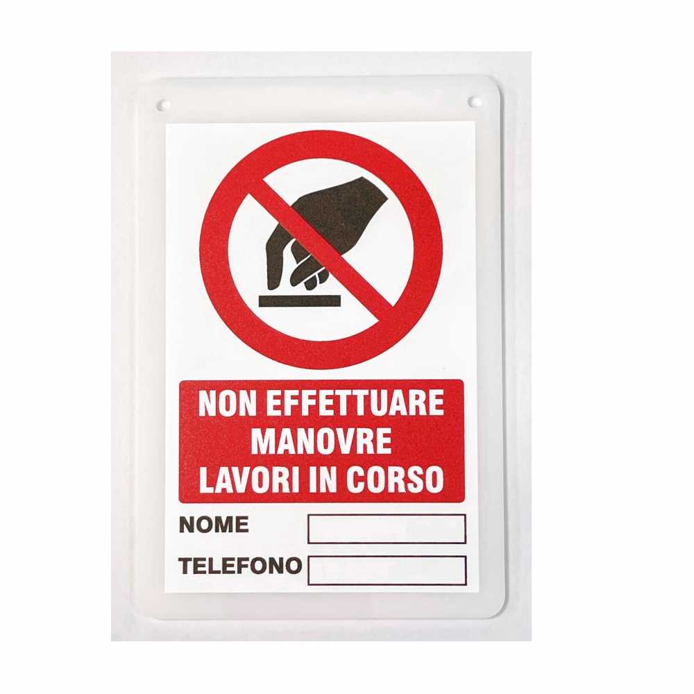 Targhetta in opalino bianco semiopaco spessore 3 mm, stampa UV pittogramma e scritta non effettuare Manovre Lavori in Corso con spazio per nome e numero di telefono, fori da 4 mm in alto e angoli arrotondati.
