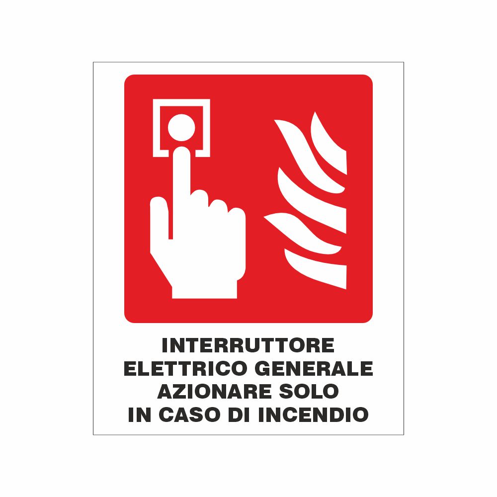 Cartello in alluminio preverniciato bianco, spessore 0,5 mm, stampa serigrafica pittogramma e scritta interruttore elettrico generale - usare solo in caso di emergenza, conforme UNI EN ISO 7010. Formato 200x300 mm. Conforme D.Lgs. 81-08, UNI 7543, UNI EN ISO 7010.