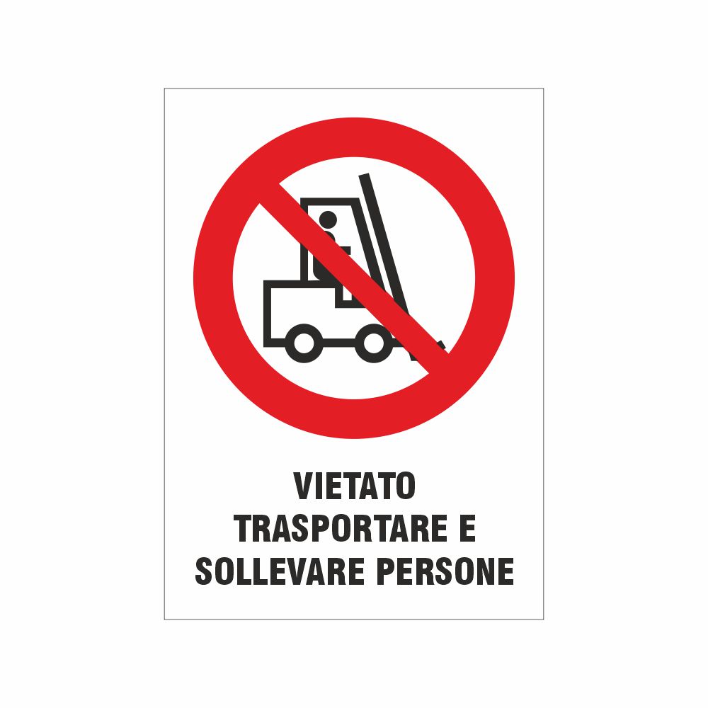 Adesivo da apporre in vicinanza o sopra i carrelli elevatori per vietare il trasporto o il sollevamento di persone che potrebbe causare incidenti o infortuni sul lavoro.
