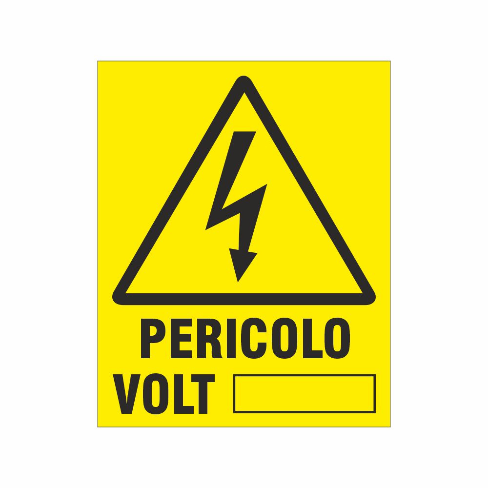 Adesivo con fondo giallo per la segnalazione quadri elettrici o fonti elettriche con conseguente rischio di folgorazione- simbolo e scritta Pericolo corrente elettrica e spazio per l'indicazione dei Volt.