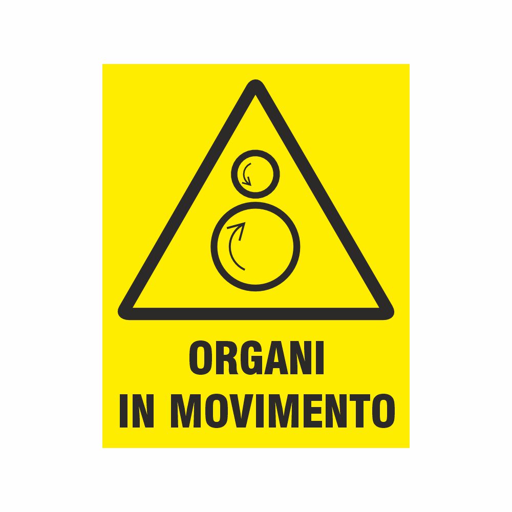 Adesivo 50x60 mm con fondo giallo da apporre sopra le attrezzature dove sussiste il rischio di trascinamento da rulli controrotanti al fine di evitare incidenti o infortuni. Simbolo e scritta Pericolo organi in movimento.